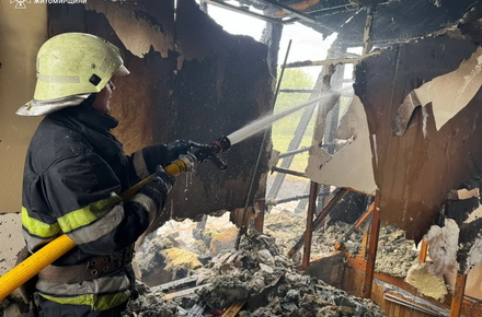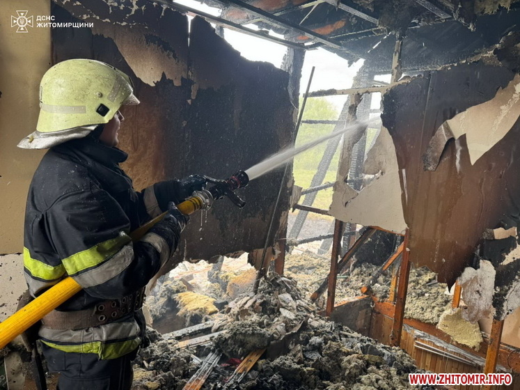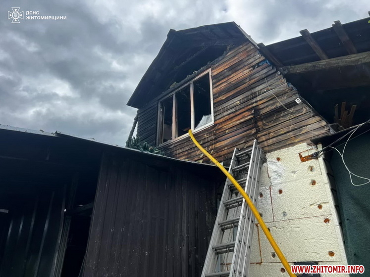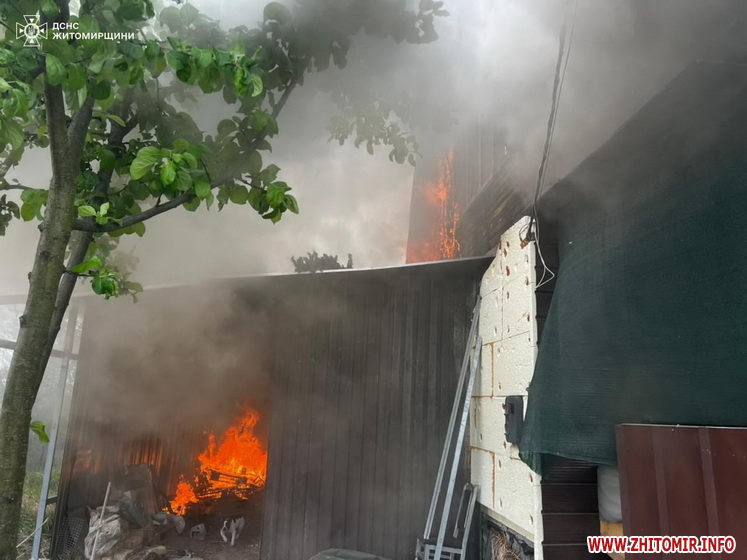 «9 травня о 13:56 до Служби порятунку «101» надійшло повідомлення про пожежу в господарчій будівлі, яка поширилась на житловий будинок у Звягелі. По прибуттю бійців ДСНС було вогнем охоплено господарчу споруду та мансарду, впритул розташованого житлового будинку. Ускладнювало процес гасіння те, що будинок був критий жестю. Для підвозу води було залучено ще одне відділення вогнеборців. Година знадобилася рятувальникам для ліквідації пожежі. Вогнем знищено майно в господарчій споруді, перекриття оселі на площі 40 кв. м, частково пошкоджено покрівлю», - йдеться в повідомленні.