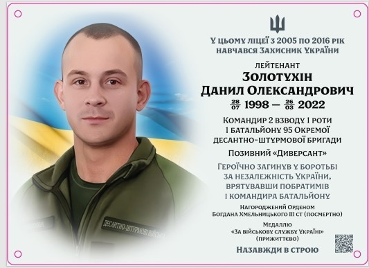 На фасадах житомирських ліцеїв №21 та №6 встановлять меморіальні дошки захисникам України – лейтенанту, командиру 2 взводу 1 роти 1 батальйону 95-ї ОДШБр Данилу Золотухіну та старшому лейтенанту міліції, кулеметнику 72-ї ОМБр ім.Чорних Запорожців Федору Наливайку.