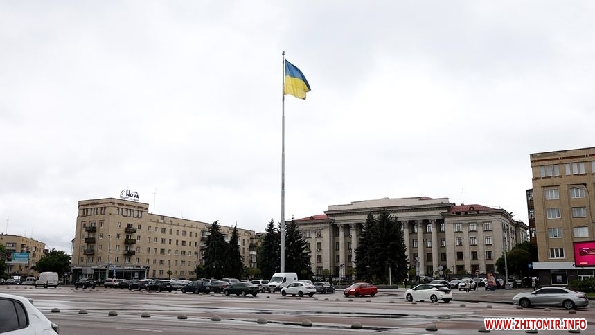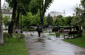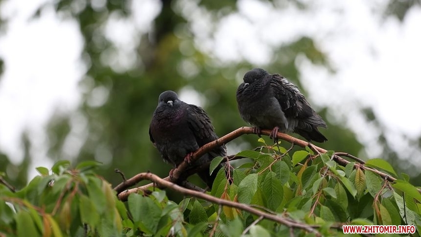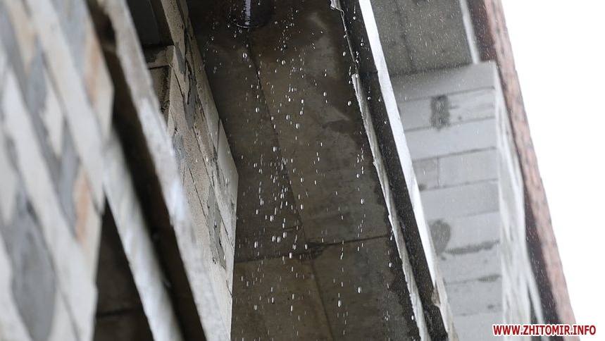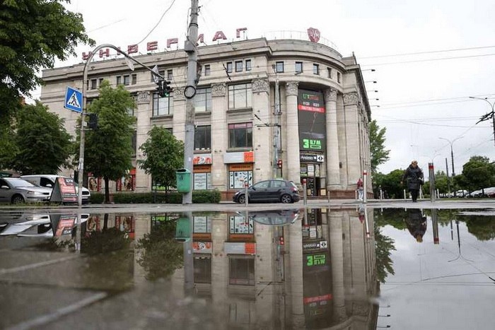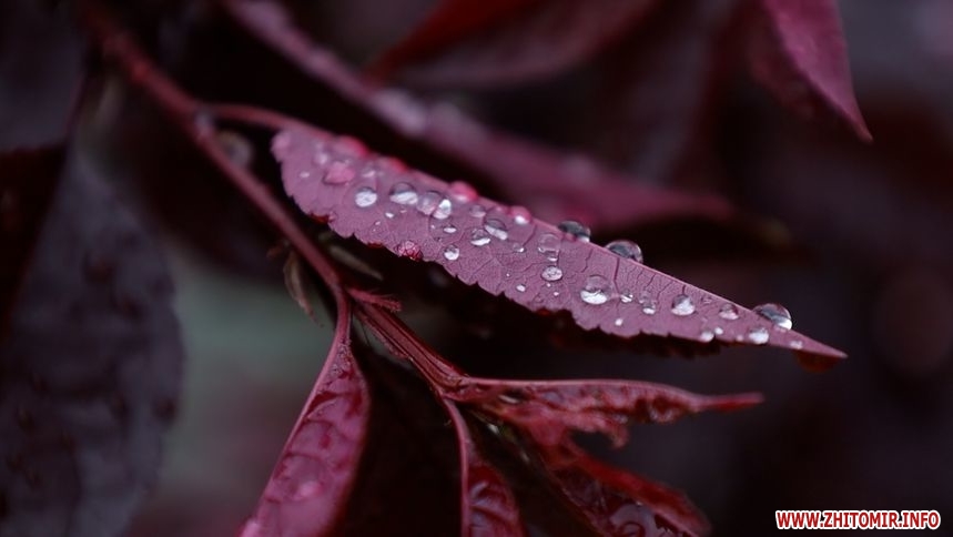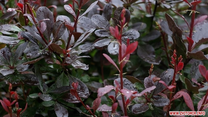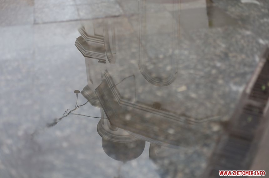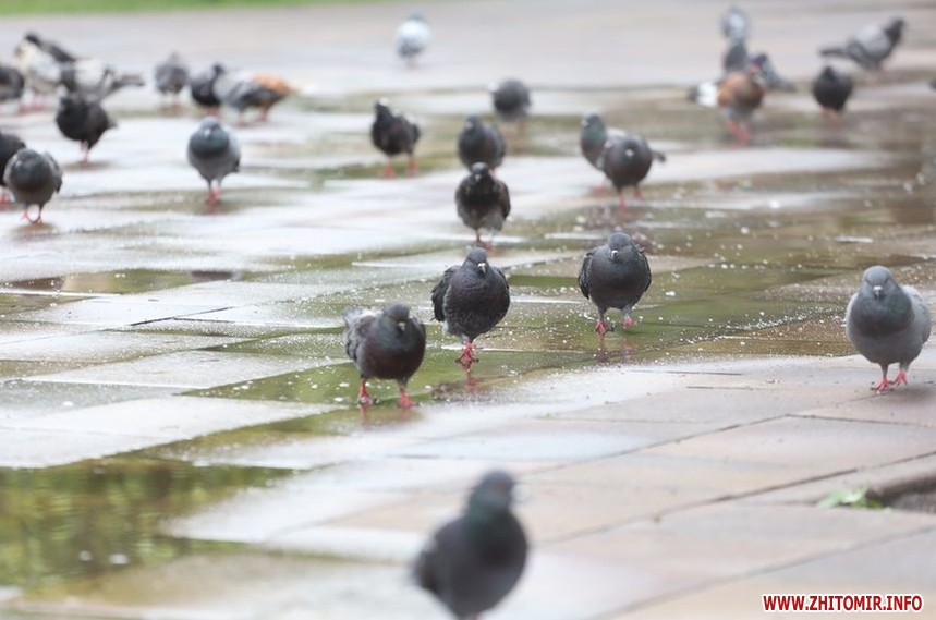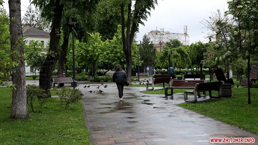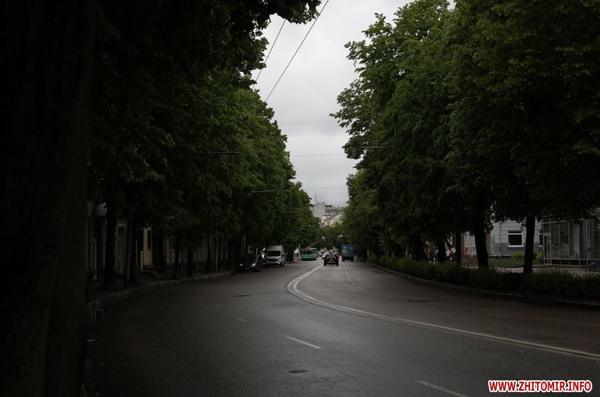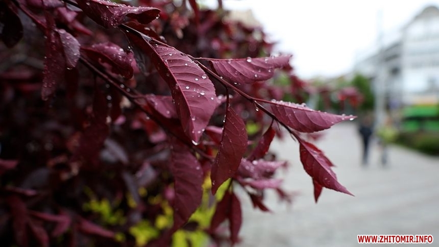 Зранку 16 травня у Житомирі дощило, в обідній час на вулицях міста можна побачити калюжі, які віддзеркалюють будівлі, краплі води на деревах та запітнілі вікна у тролейбусах.