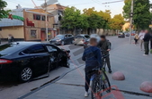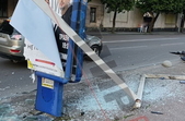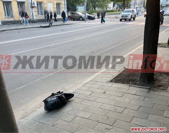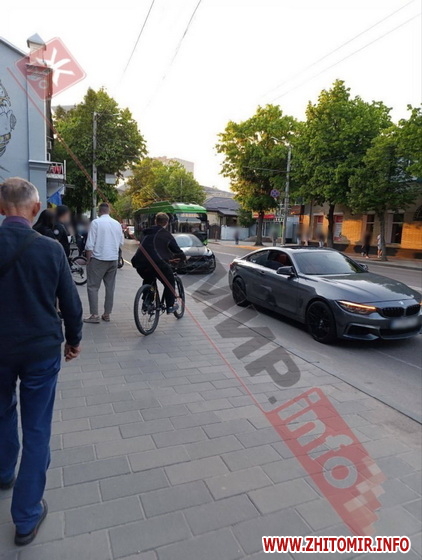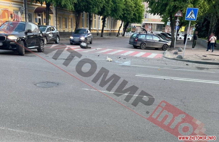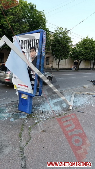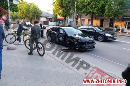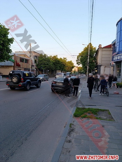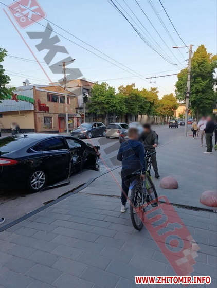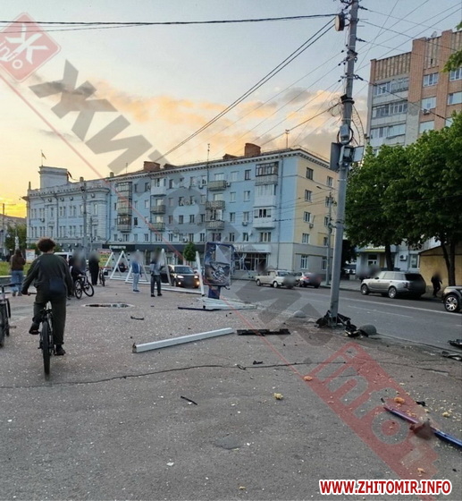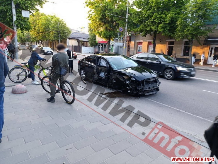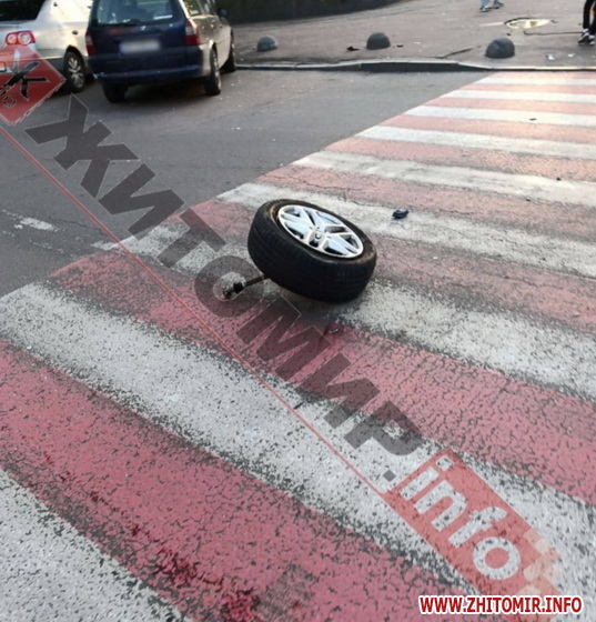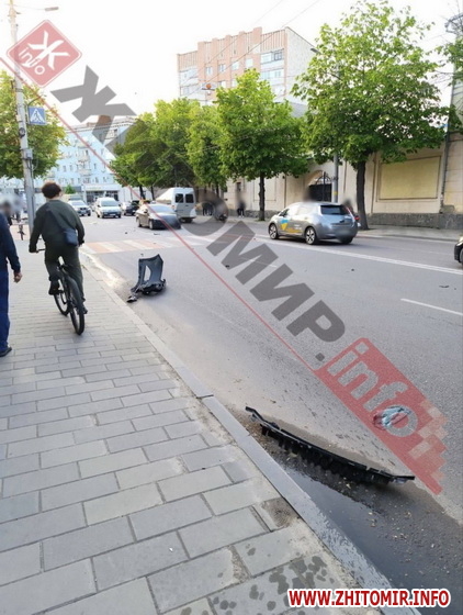 Увечері 21 травня у середмісті Житомира не розминулися BMW та Ford. Внаслідок ДТП пошкоджені металеві конструкції, сітілайт та електроопора на тротуарі. Колесо, що відпало від авто Ford, пошкодило транспортний засіб Nissan.
