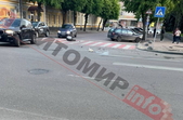 «На відео результат недотримання безпечної швидкості руху на бокового інтервалу Автопригода сталася вчора, близько 20-ї години, на перехресті вулиць Малої Бердичівської та Великої Бердичівської за участю трьох автівок, обійшлося без потерпілих. На місці ми встановили, що водій транспортного засобу BMW не вибрав безпечної швидкості руху, не врахував дорожньої обстановки, не дотримався безпечного бокового інтервалу та зіткнувся з авто Ford, який по інерції від зіткнення, наїхав на металеві конструкції, сітілайт та електроопору на тротуарі», - йдеться у повідомленні.