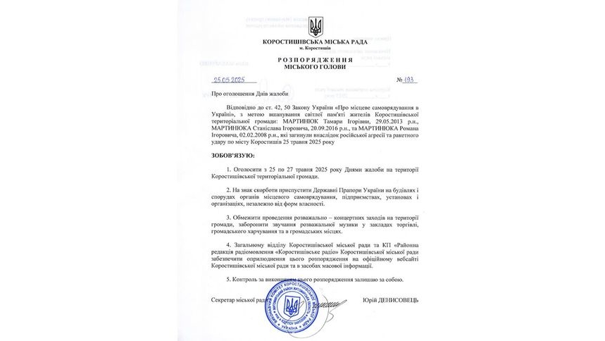 На території Коростишівської територіальної громади оголосили Дні жалоби з 25 по 27 травня.