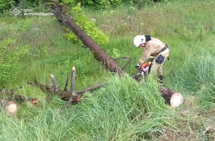 «У селі Клочеве Коростенського району дерево впало на дорогу та перекрило рух транспорту в обидва боки. За допомогою бензопил рятувальники прибрали його та звільнили шлях для водіїв. На подібні роботи фахівці ДСНС залучались також неподалік с. Йосипівка Житомирського району», - йдеться в повідомленні.