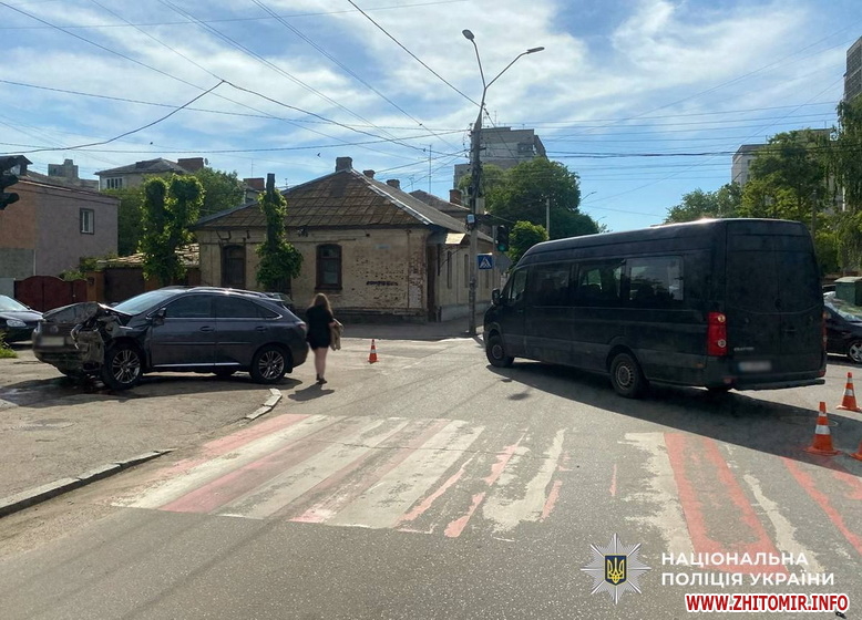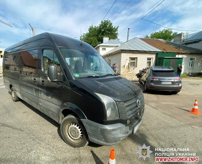 У Житомирі на перехресті вулиць Святослава Ріхтера та Довженка 3 червня близько 8:50 сталася ДТП. Після зіткнення з мікроавтобусом кросовер в’їхав у будинок. Поліцейські встановлюють обставини аварії.
