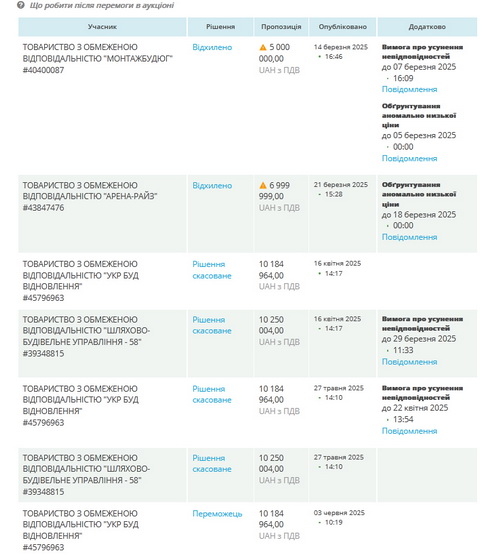 В системі «Прозорро» 3 червня 2025 року оприлюднили інформацію про намір укласти договір з ТОВ «Укр Буд Відновлення», яке має провести демонтажні роботи за 10 млн 184 тис. 964 грн.