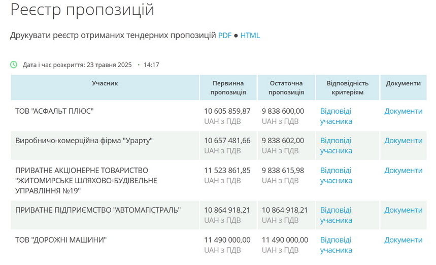 Заявки на торги, які проводили 23 травня, подали п’ятеро учасників, троє з них під час торгів зменшували свою первинні пропозиції і в результаті переможцем стало ТОВ «Асфальт плюс», яке запропонувало найменшу ціну – 9 млн 838 тис. 600 грн.