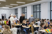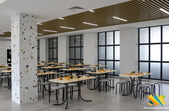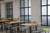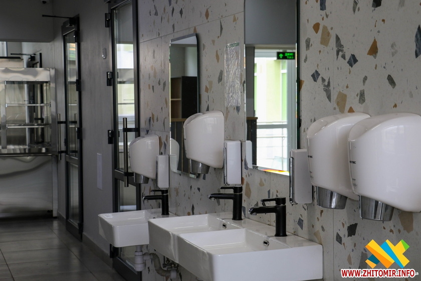 Їдальня тепер розрахована на 162 посадкові місця. Простір став безбар’єрним: понижений умивальник, спеціально облаштовані місця для маломобільних груп, підіймач к і відсутність порогів на вході забезпечують доступність для всіх учасників освітнього процесу.