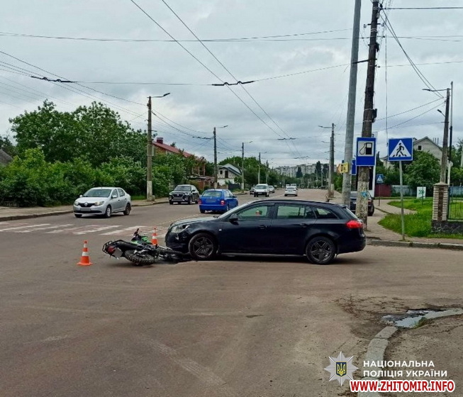 «Дорожньо-транспортна пригода сталася 13 червня на вулиці Покровській в обласному центрі. На місці події працювала слідчо-оперативна група Житомирського районного управління поліції №1. Попередньо, близько 11:00 відбулося зіткнення між автомобілем Opel під керуванням 29-річного житомирянина, який здійснював маневр повороту, та мотоциклом Shineray. У результаті ДТП водій двоколісника, 16-річний житель обласного центру, отримав травми та був ушпиталений», - йдеться у повідомленні.