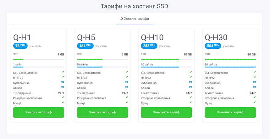 Вибирайте оптимальний тариф, спираючись на кількість сайтів і обсяг пам’яті. До речі, QHost пропонує SSL для шифрування даних безоплатно.