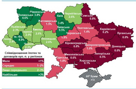 Для порівняння, у Рівненській цей показник дорівнює 3,8%, Волинській – 4,6%, Чернігівській, Вінницькій та Хмельницькій – 2,6%. Іпотека все ще не є рушієм попиту на ринку нерухомості. Частка угод із купівлі житла, профінансованих в іпотеку, коливається близько 2–3% – нижче рівня 2021 року. Однак ця частка досить нерівномірна між регіонами – у Київській області вона значно вища і становить 10% за останній рік. У цілому більше житла в іпотеку придбавають у західних регіонах та в столиці.