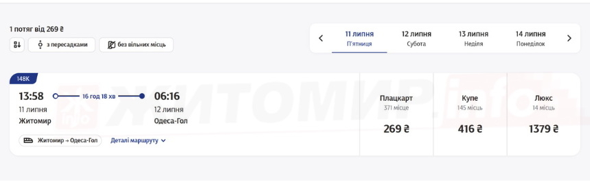 Зауважимо, вартість квитка на потяг «Житомир - Одеса» буде 269 гривень за місце у плацкарті, купе - 416, а люкс - 1379 гривень.