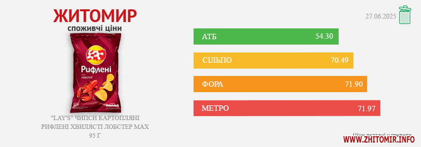 Моніторинг здійснено на основі інформації, отриманої за методом контрольної закупки 27.06.2025 р. у місцях продажу: АТБ, пр. Миру, 15 А, Фора, вул. Київська, 106, Метро, вул. Ватутіна, 55-в, Сільпо, вул. Житній ринок, 1