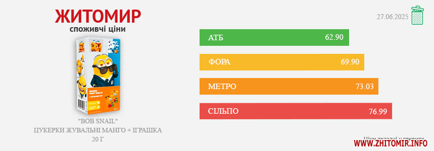 Моніторинг здійснено на основі інформації, отриманої за методом контрольної закупки 27.06.2025 р. у місцях продажу: АТБ, пр. Миру, 15 А, Фора, вул. Київська, 106, Метро, вул. Ватутіна, 55-в, Сільпо, вул. Житній ринок, 1