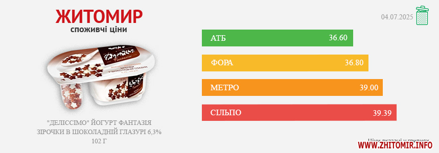 Моніторинг здійснено на основі інформації, отриманої за методом контрольної закупки 04.07.2025 р. у місцях продажу: АТБ, пр. Миру, 15 А, Фора, вул. Київська, 106, Метро, вул. Ватутіна, 55-в, Сільпо, вул. Житній ринок, 1