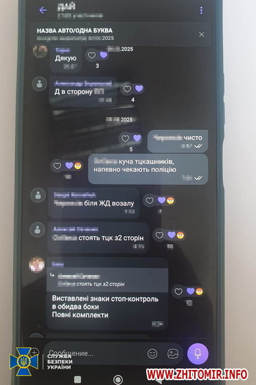 «На Житомирщині СБУ викрила адміністратора та інформатора спільнот для «ухилянтів». Співробітники Служби безпеки встановили адміністратора Viber-каналу та інформатора Telegram-спільноти, які перешкоджали мобілізаційним заходам на Житомирщині. Ці Інтернет-ресурси із загальною аудиторією у декілька десятків тисяч користувачів в режимі реального часу інформували про маршрути переміщення мобільних груп ТЦК та поліції на території регіону», - йдеться в повідомленні.