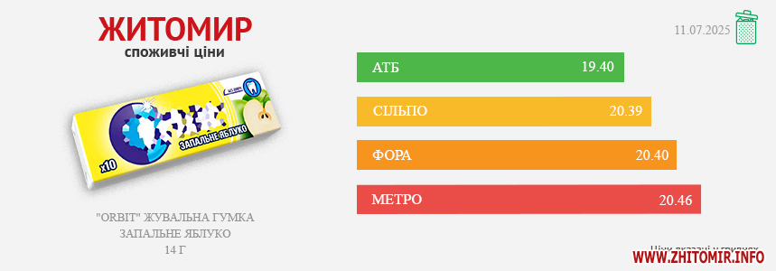 Моніторинг здійснено на основі інформації, отриманої за методом контрольної закупки 11.07.2025 р. у місцях продажу: АТБ, пр. Миру, 15 А,Фора, вул. Київська, 106, Метро, вул. Ватутіна, 55-в, Сільпо, вул. Житній ринок, 1