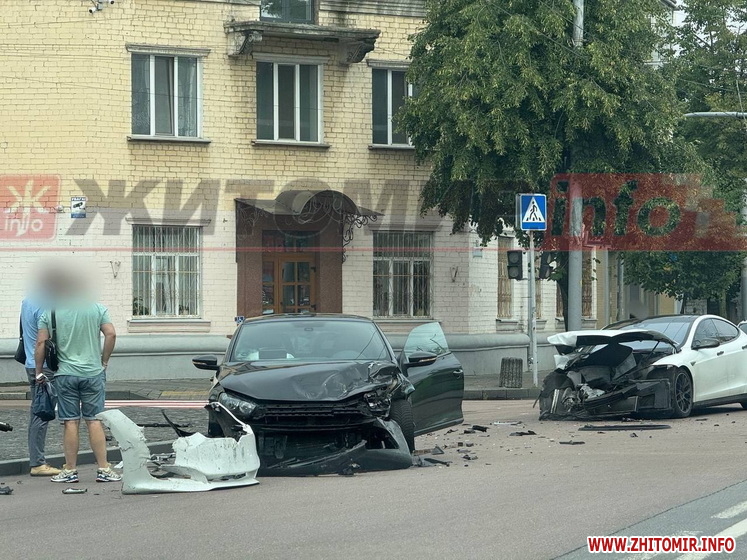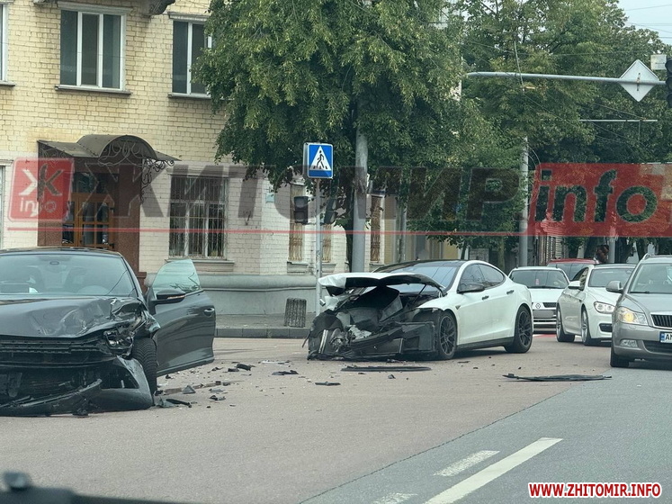 Вранці 21 липня на перехресті поблизу бульвару у Житомирі не розминулися дві автівки - біла Tesla та Volkswagen. Попередньо, ДТП без потерпілих. Рух транспорту на місці автопригоди частково ускладнений.