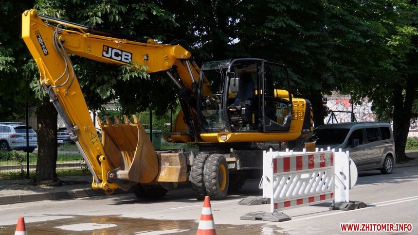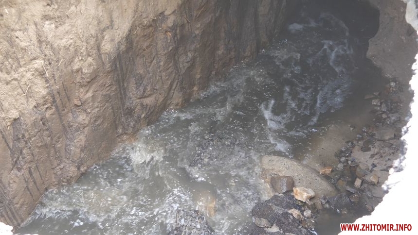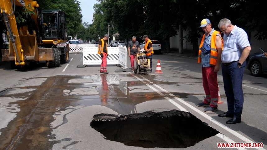 «Вчора тут провалися самопливний каналізаційний колектор діаметром 800 мм. Річ у тому, що було багато дощів на вихідних, він наповнився, йому вже близько 50 років, і ми розуміємо, що підмок свод колектора, тому він провалився й утворилося провалля. Зараз (22 липня 10:30) ми робимо підготовчі роботи, колектор буде розкопаний, вставимо вставку труби. Плануємо завершити 22 липня, якщо не встигнемо, то завтра 23 липня роботи будуть завершені. Водопостачання відключати не плануємо, виконаємо роботи при включеній системі водопостачання, водовідведення. Зараз залучено близько 5 одиниць техніки та 10 людей», – розповідає директор КП «Житомирводоканал» Роман Ілик.
