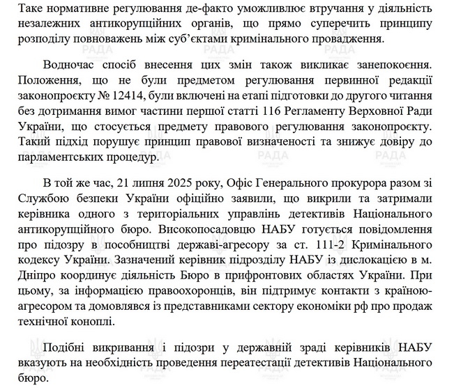 Нагадаємо, 22 липня 263 народні депутати проголосували в цілому за законопроєкт №12414, який стосувався змін до КПК України щодо особливостей досудового розслідування кримінальних правопорушень, пов’язаних із зникненням осіб безвісти за особливих обставин в умовах воєнного стану: у першому читанні він був прийнятий 29 квітня 2025 року, а до другого читання в нього внесли суттєві правки. Президент цього ж дня підписав закон, який впливає на роботу САП та НАБУ і робить їх залежними від рішень генерального прокурора. Увечері 22 липня в Києві та деяких інших містах люди вийшли на акцію протести з вимогою скасувати закон.