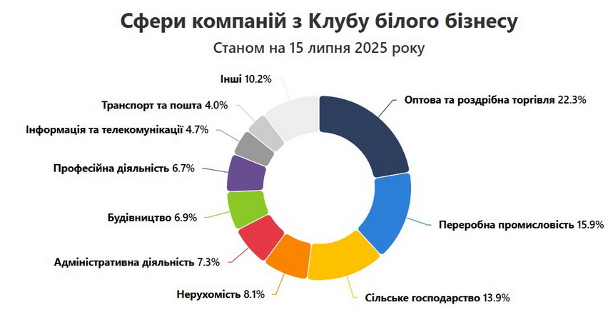 Найбільше представників Клубу — у сфері торгівлі: 22% компаній займаються оптовою або роздрібною торгівлею чи ремонтом автотранспорту. На другому місці — переробна промисловість (16%), третє — за сільським, лісовим і рибним господарством (14%). Далі йдуть нерухомість (8%) і адміністративне обслуговування (7%).