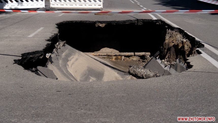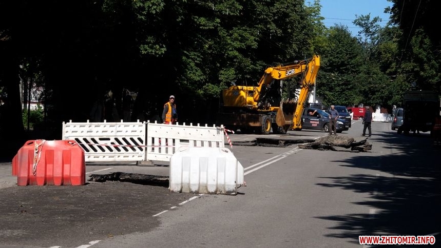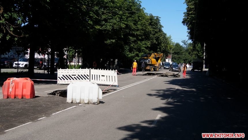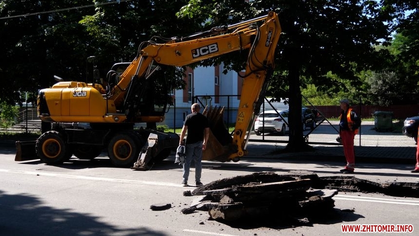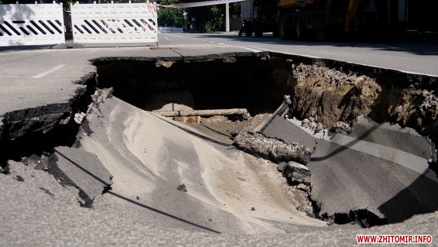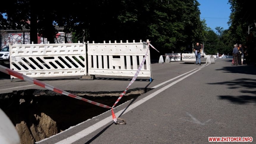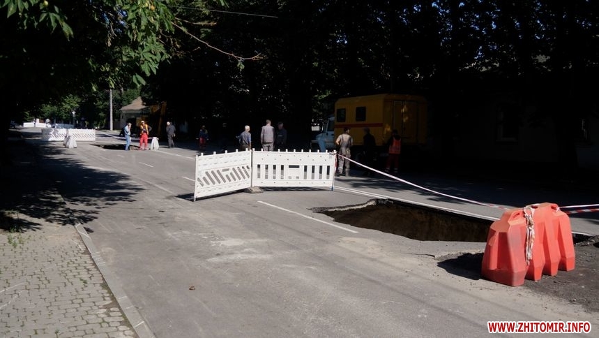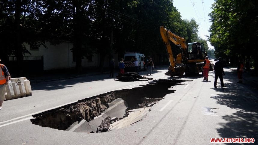 «Колектор провалився на двох ділянках, вночі фахівці огородили їх. Протягом 2–7 днів тут будуть проводити аварійно-відновлювальні роботи. Перше провалля утворилося близько 16:00, друге близько 21:00. Цей колектор старий, йому 50 років, до того ж у місті випала велика кількість опадів, у зв'язку з чим колектор не впорався з навантаженням такої кількості опадів. Плануємо, що нам доведеться замінити близько 40 м колектора, більш точну протяжність будемо знати, коли проведемо розкопки», – говорить начальниця інформаційного центру КП «Житомирводоканал» Сніжана Герасимчук.