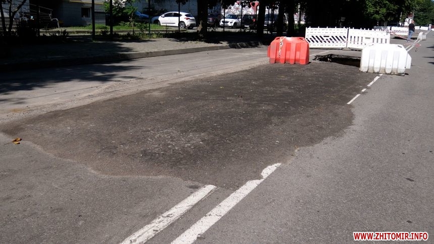 Ввечері 30 липня на вулиці Фещенка-Чопівського на двох ділянках провалився асфальт. Сьогодні, 31 липня, працівники КП «Житомирводоканал» проводять ремонтні роботи. Через аварійну ситуацію перекрили рух від перехрестя зі Старим бульваром до перехрестя з вулицею Шляхетною.