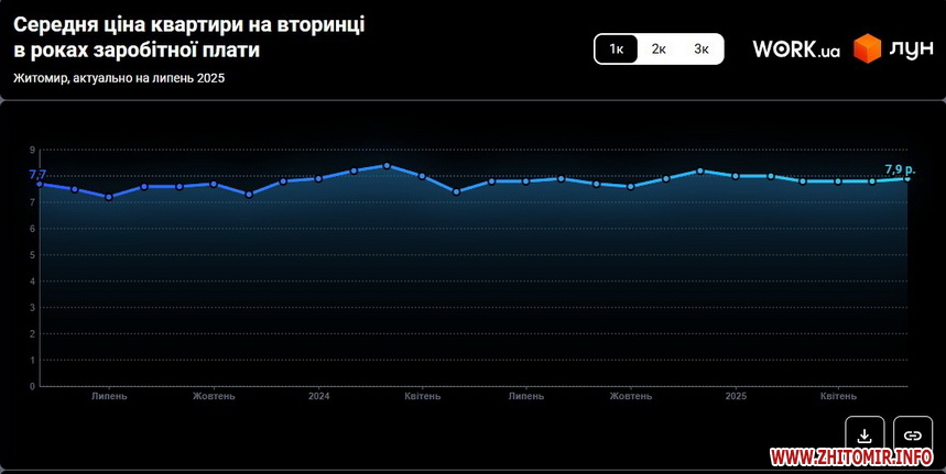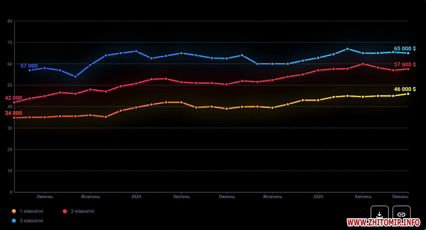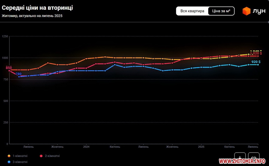 За даними компанії ЛУН, яка створює сервіси для покупки та оренди житла в Україні, середня вартість однокімнатної квартири на вторинному ринку Житомира у липні 2025 року склала 46 тис. дол., що на 7 тисяч дол., або на 18% більше, ніж у липні 2024 року, коли «однушка» коштувала 39 тис. дол.