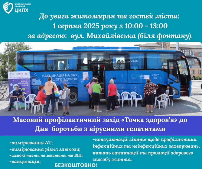 Напередодні ДУ «Житомирський обласний центр контролю та профілактики хвороб Міністерства охорони здоров’я» анонсував проведення 1 серпня у Житомирі на Михайлівській (біля фонтану) акції «Точка здоров’я» для боротьби з вірусним гепатитом.