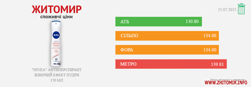 Моніторинг здійснено на основі інформації, отриманої за методом контрольної закупки 25.07.2025 р. у місцях продажу: АТБ, пр. Миру, 15 А, Фора, вул. Київська, 106, Метро, вул. Ватутіна, 55-в, Сільпо, вул. Житній ринок, 1