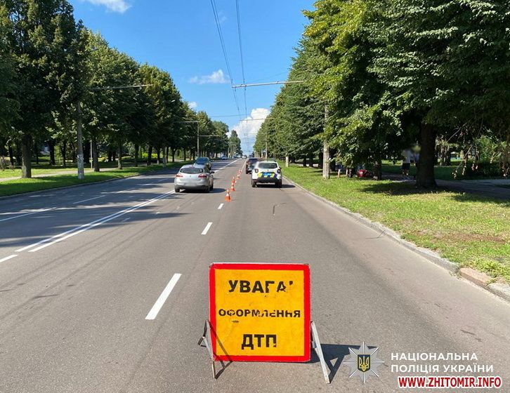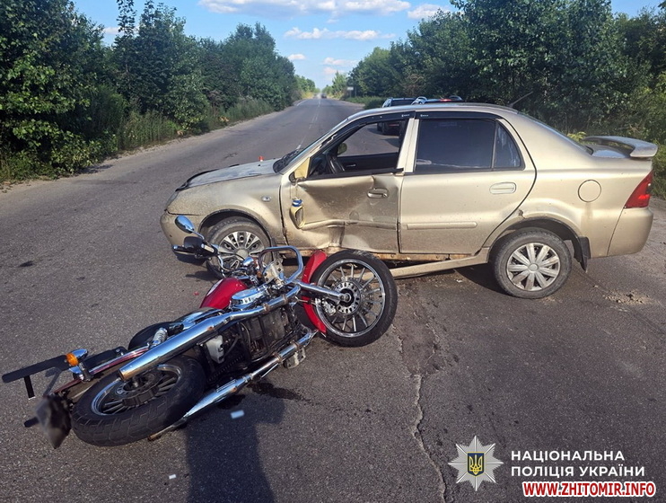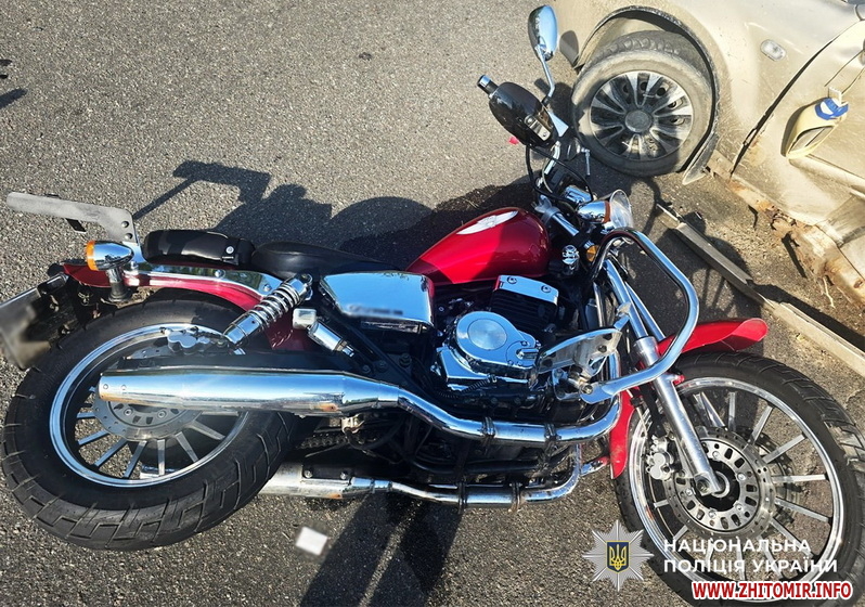 Близько 14:36 на майдані Польовий сталося зіткнення автомобіля Hyundai Santa Fe, під керуванням 45-річного житомирянина, та мотоцикла Honda, яким керував 33-річний місцевий житель.