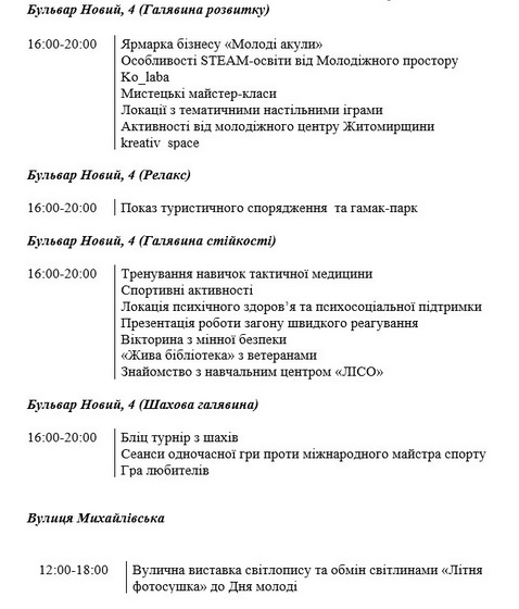 У Житомирі на Новому бульварі 12 серпня 2025 року організують заходи до Міжнародного дня молоді.
