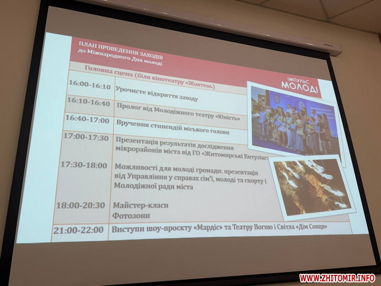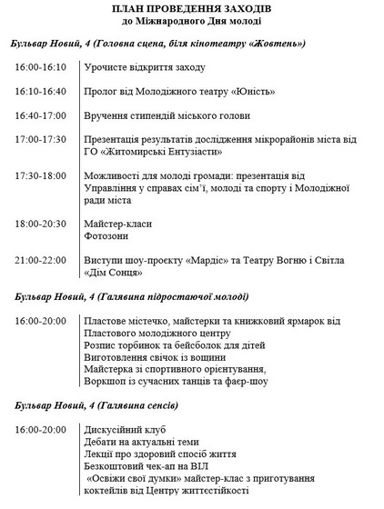 «З метою патріотичного виховання молоді, утвердження цінностей демократії та свободи, популяризації громадянського суспільства та відзначення в місті Житомирі Міжнародного дня молоді, відповідно до Указу Президента України«Про День молоді», на виконання цільової соціальної програми «Житомирська міська об'єднана територіальна громада - територія самореалізації молоді та підтримки сім'ї» на 2021-2025 роки, відповідно до статей 32, 38 Закону України «Про місцеве самоврядування в Україні», виконавчий комітет міської ради вирішив: управлінню у справах сім’ї, молоді та спорту Житомирської міської ради спільно з Молодіжною радою при Житомирській міській раді, підвідомчими установами, громадськими організаціями та об’єднаннями (за згодою) забезпечити проведення в місті Житомирі 12 серпня 2025 року на бульварі Новому заходи на відзначення Міжнародного дня молоді, з урахуванням вимог до проведення заходів у період воєнного стану, відповідно до плану згідно з додатком», - йдеться в рішенні.