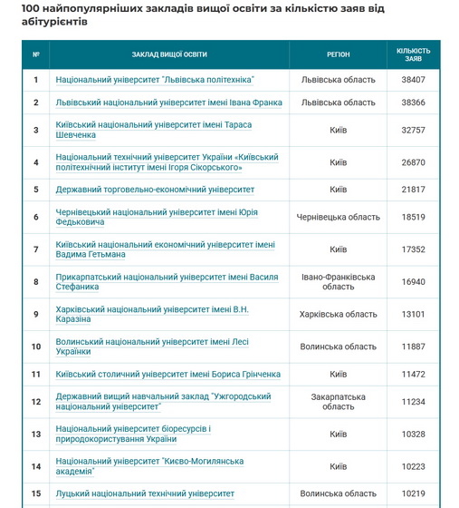 Цьогорічними лідерами за кількістю заяв від абітурієнтів, які вступають на основі повної загальної середньої освіти, є Національний університет «Львівська політехніка» та Львівський національний університет ім. Франка, наступні три місця посіли київські ЗВО – Київський національний університет ім. Шевченка, Київський політехнічний інститут ім. Сікорського, Державний торговельно-економічний університет.