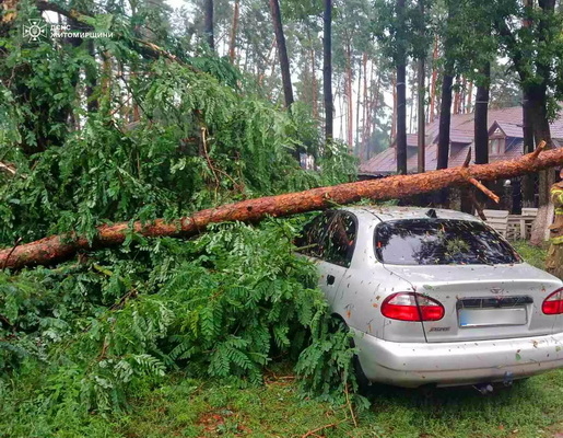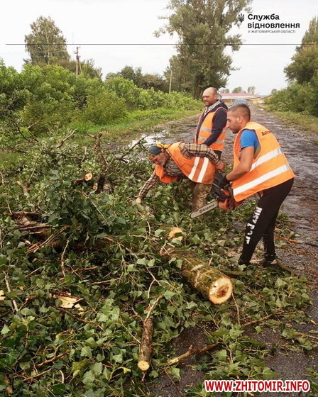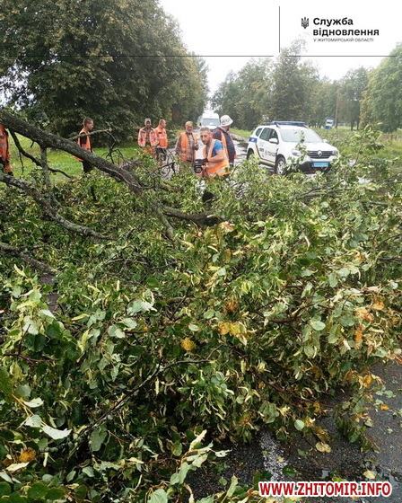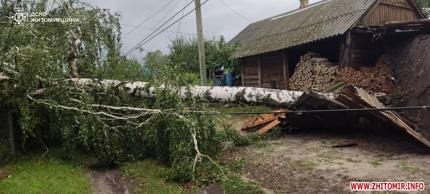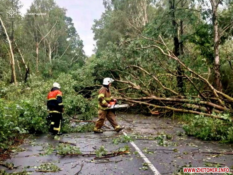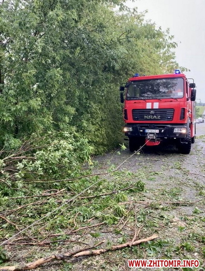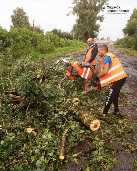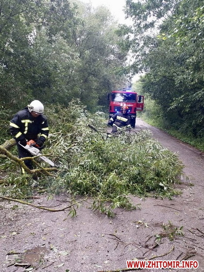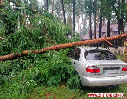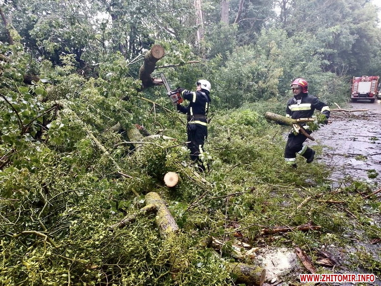 «Упродовж дня рятувальники Житомирщини 6 разів залучалися до ліквідації наслідків негоди. Сильна злива, що пройшла територією області, спричинила повалення дерев. Станом на 21:00 рятувальники вже прибрали 100 дерев, що перекривали дороги, падали на автівки та будівлі. Зокрема, поблизу с. Разіне Романівської громади Житомирського району рятувальники протягом 2,5 годин розрізали та прибирали 25 аварійних дерев. Крім цього, поблизу с. Більківці Коростишівської громади того ж району дерево впало на легковий автомобіль. А у с. Троянів береза впала на дах господарчої будівлі, пошкодила паркан та лінію електропередач. Наразі тривають роботи по прибиранню дерев ще в трьох населених пунктах», - йшлося в повідомленні.