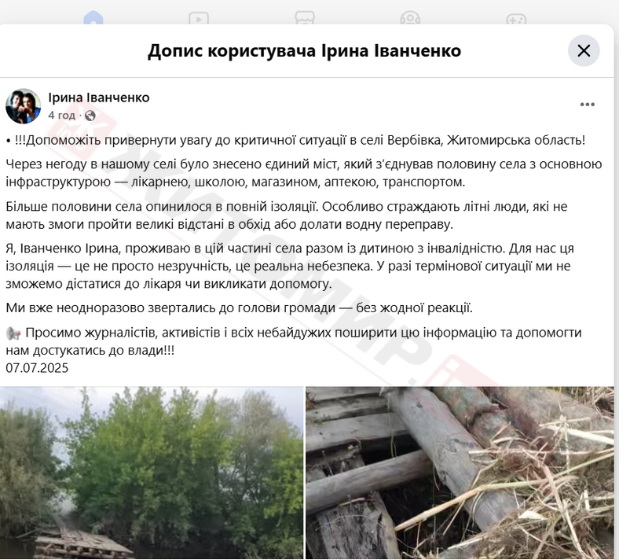 «Допоможіть привернути увагу до критичної ситуації в селі Вербівка, Житомирська область! Через негоду в нашому селі було знесено єдиний міст, який з’єднував половину села з основною інфраструктурою — лікарнею, школою, магазином, аптекою, транспортом. Більше половини села опинилося в повній ізоляції. Особливо страждають літні люди, які не мають змоги пройти великі відстані в обхід або долати водну переправу. Я, Іванченко Ірина, проживаю в цій частині села разом із дитиною з інвалідністю. Для нас ця ізоляція — це не просто незручність, це реальна небезпека. У разі термінової ситуації ми не зможемо дістатися до лікаря чи викликати допомогу», - пише Ірина Іванченко.