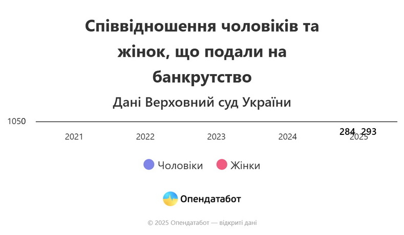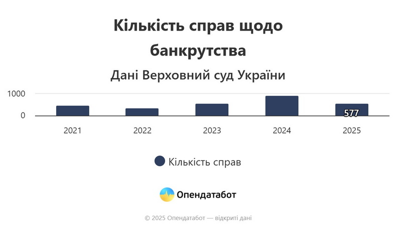 «В Україні зростає кількість людей, які вирішують оголосити себе банкрутами. Так, понад 2,9 тисячі українців стали банкрутами за останні 5 років в Україні за даними Верховного суду. 577 українців вже подали заяви про банкрутство за перші 6 місяців 2025 року. У 52% випадків неплатоспроможним себе просять визнати чоловіки. Найбільше банкрутів цьогоріч у Києві, на Київщині та Львівщині. Таких випадків побільшало на 33% порівняно до того ж періоду у 2024. Загалом, найбільше людей стало банкрутами торік: 926 справ, втім поточний рік ризикує наздогнати ці показники», - йдеться в повідомленні.