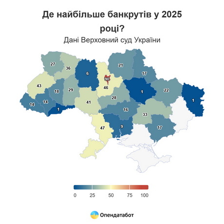 Найбільше справ про банкрутство у 2025 році відкрили в Києві — 90. На другому місці Одещина з 47 справами, наслідує Київщина, де подано 46 заяв.