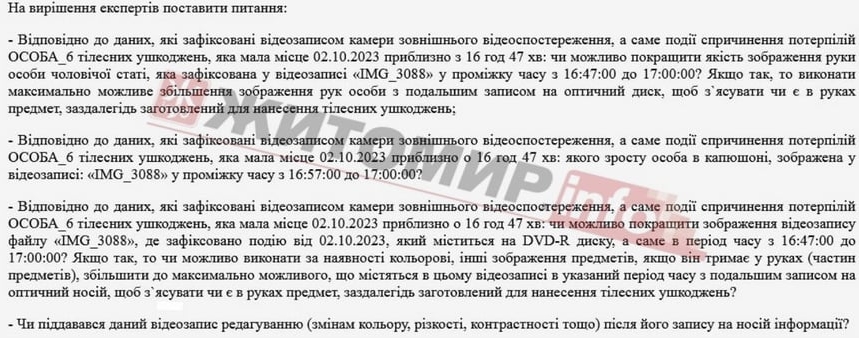 «В судовому засіданні захисник ОСОБА_4 адвокат ОСОБА_5 підтримала своє раніше подане клопотання про призначення судової фототехнічної експертизи відеозапису з камер зовнішнього відеоспостереження за адресою: вул. Домбровського, 59 В, оскільки під час досудового розслідування не проводилася фототехнічна експертиза та експертиза матеріалів відеозапису на предмет того, чи були предмети у руках особи, яка зображена на відеозаписі. Просила на вирішення експерта поставити наступні питання: чи можливо покращити якість зображення руки особи чоловічої статі; якого зросту особа в капюшоні, зображена у відеозаписі; чи піддавався даний відеозапис редагуванню (змінам кольору, різкості, контрастності тощо) після його запису на носій інформації», - йдеться в ухвалі суду.