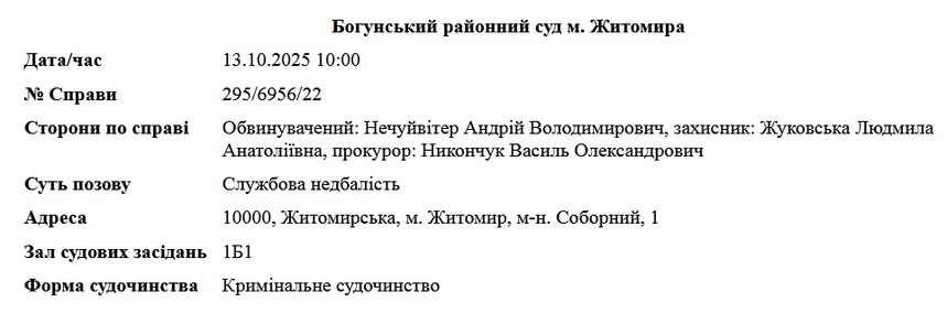 В липні 2022 року до Богунського районного суду надійшов обвинувальний акт у справі про службову недбалість начальника ТТУ, якого з цієї посади звільнили в листопаді 2021 року, розгляд триває й досі – чергове засідання призначене на 13 жовтня 2025 року.
