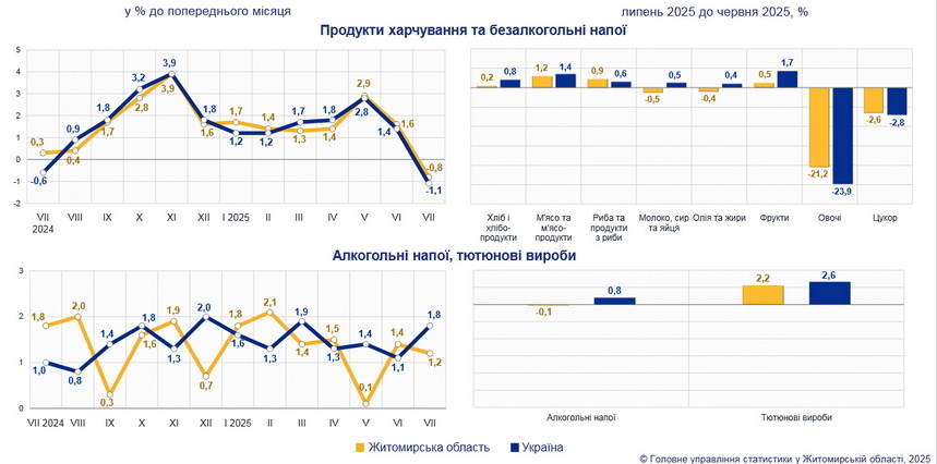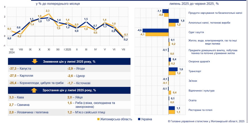 Споживчі ціни у липні 2025 року порівняно з червнем 2025 року по області зменшились на 0,1%, по Україні – на 0,2%.