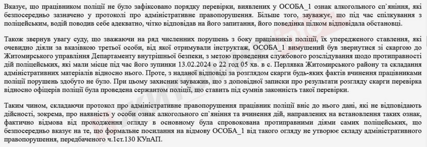 «Зі змісту протоколу про адміністративне правопорушення убачається, що 13.02.2025 о 22:08 в с. Корчак, дорога а.д. Житомир-Чернівці 13 км 300 м водій ОСОБА_1 керував транспортним засобом Tesla Model S з явними ознаками алкогольного сп`яніння, а саме: запах алкоголю з порожнини рота, порушення координації рухів, порушення мови, поведінка, що не відповідає обстановці. Від проходження огляду на стан алкогольного сп`яніння на місці зупинки за допомогою газо-аналізатора Alcotest Drager та в найближчому медичному закладі охорони здоров`я водій відмовився. Від керування транспортного засобу відсторонено згідно ст. 266 КУпАП, шляхом зупинки у дозволеному місці згідно ПДР, чим порушив вимоги п.2.5 Правил дорожнього руху, відповідальність передбачена ч.1 ст.130 КУпАП», - йдеться в постанові суду.