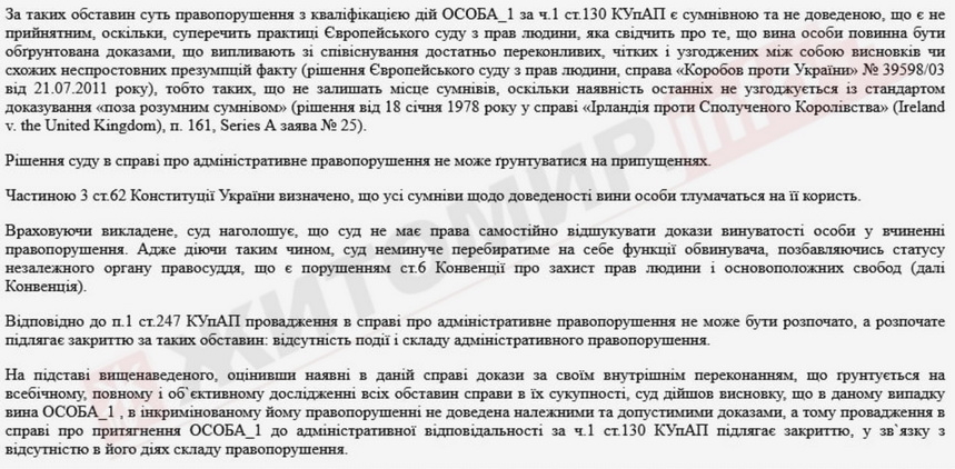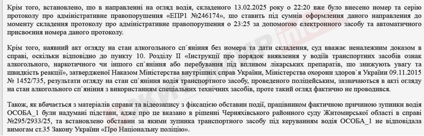 В постанові Черняхівського райсуду від 12 серпня 2025 року, яку оприлюднили 18 серпня, зазначається, що суд оцінивши наявні в даній справі докази за своїм внутрішнім переконанням, що ґрунтується на всебічному, повному і об`єктивному дослідженні всіх обставин справи в їх сукупності закрив провадження «за відсутністю в діях особи, яка притягається до відповідальності, складу адміністративного правопорушення».