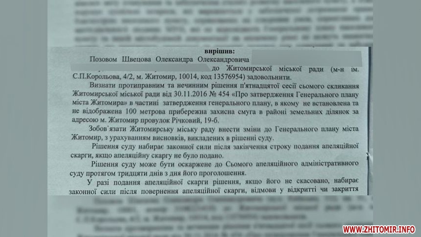 Постановою Житомирського апеляційного суду від 07.12.2023 скасовано рішення Богунського районного суду в частині відмови у задоволенні вимоги щодо винесення спірного будинку за межі прибережної захисної смуги річки Тетерів та ухвалено в цій частині нове судове рішення про задоволення позову.