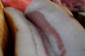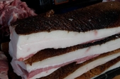 «Це сало з лопатки й крижової частини, ціна за кг – 230 грн, зі спинки 280 – 300 грн. Хто любить сало приходить і купує. Ціна збільшилася й набагато, минулого року було дешевше, мабуть, коштувало 200 грн. М'ясо менше зараз купують, сало більше», – говорить продавчиня Зоя.