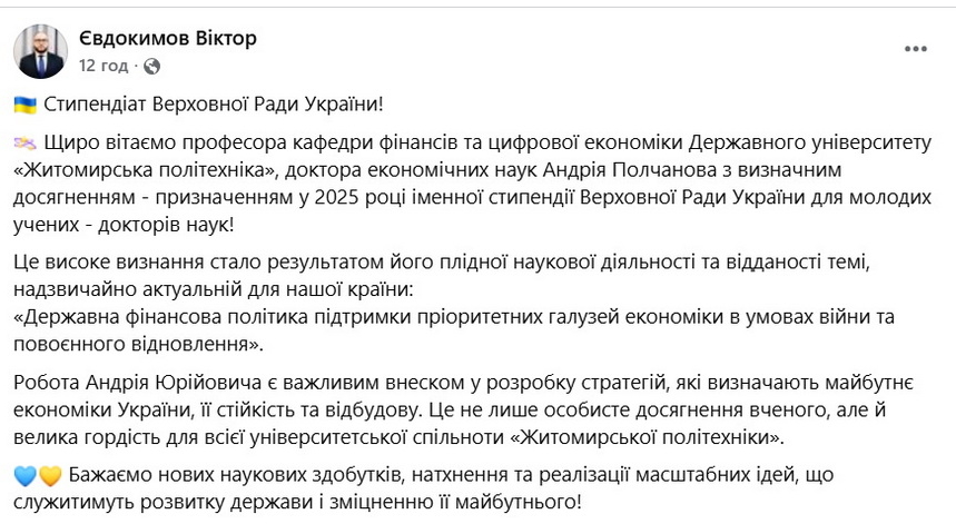 «Щиро вітаємо професора кафедри фінансів та цифрової економіки Державного університету «Житомирська політехніка», доктора економічних наук Андрія Полчанова з визначним досягненням — призначенням у 2025 році іменної стипендії Верховної Ради України для молодих учених — докторів наук! Це високе визнання стало результатом його плідної наукової діяльності та відданості темі, надзвичайно актуальній для нашої країни: «Державна фінансова політика підтримки пріоритетних галузей економіки в умовах війни та повоєнного відновлення». Робота Андрія Юрійовича є важливим внеском у розробку стратегій, які визначають майбутнє економіки України, її стійкість та відбудову. Це не лише особисте досягнення вченого, але й велика гордість для всієї університетської спільноти «Житомирської політехніки», - повідомив Віктор Євдокимов.