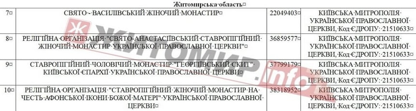 Зокрема, у Житомирській області – Житомирська єпархія Української православної церкви, Овруцько-Коростенська єпархія Української православної церкви та чотири монастирі: