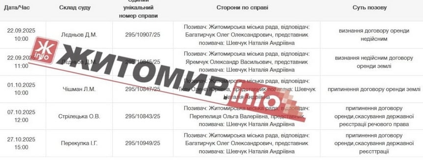 Всі справи розглядає Богунський районний суд Житомира, черговий розгляд справ призначений на вересень-жовтень 2025 року (скриншот з сайту Богунського райсуду).
