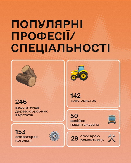 До трійки найпопулярніших професій серед учасниць увійшли: верстатниця деревообробних верстатів – 246 заявок, трактористка – 142 та операторка котельні – 153.