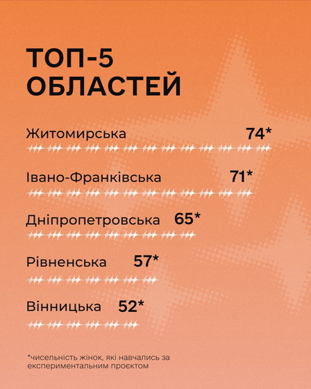 Лідерами за кількістю направлень жінок на навчання стали п’ять областей: Житомирська, Івано-Франківська, Дніпропетровська, Рівненська та Вінницька.