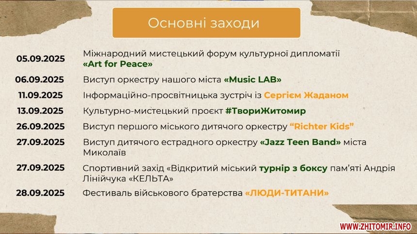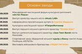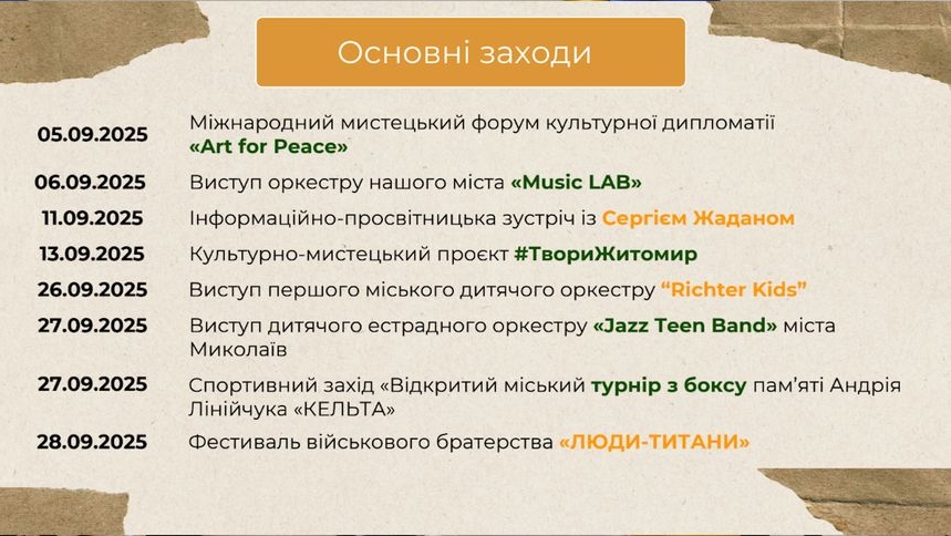 «4 вересня в музеї космонавтики ім. С.П. Корольова буде проходити презентація проєкту «Батальйон гідних» у межах молодіжних грантів «ДіяТи». 5 вересня на вул. Театральній в обласному Телецентрі буде міжнародний мистецький форум культурної дипломатії «Art for Peace». На форум запрошені Ірина Вакуліна зі Львова, Ольга Фієра з Києва, представники Міністерства культури і різні діячі культури та мистецтва в Україні. 6 вересня в Шодуарівському парку ми плануємо благодійний концерт від оркестру «Music LAB». 12 вересня відкриття виставкового проєкту «Вежа: кроки пам'яті», від команди з міста Марія спільно з «ЯМаріуполь», – розповідає начальниця управління культури Житомирської міської ради Ілона Колодій.